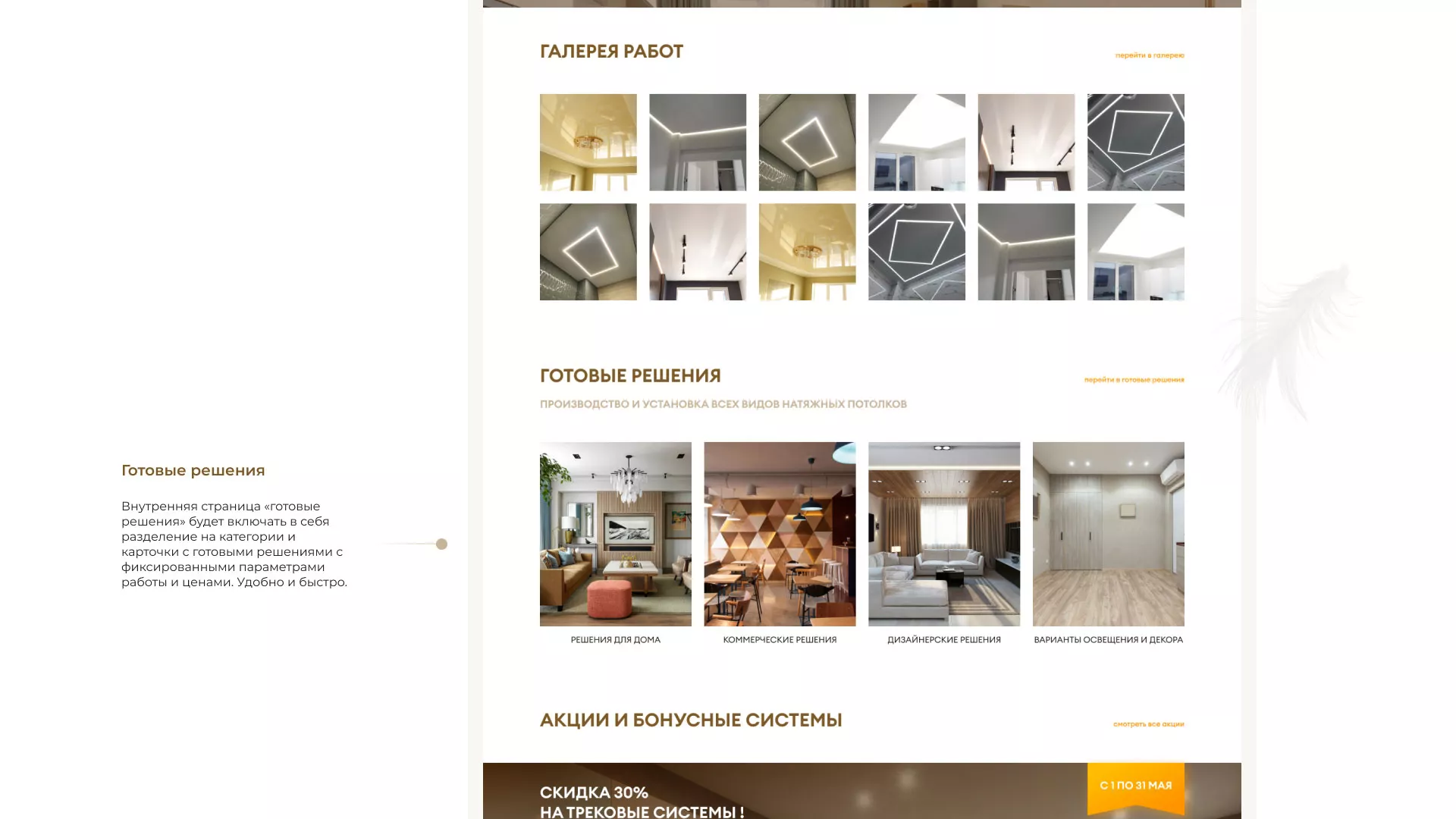 Что мы сделали. Разработали сайт в теплых и уютных «шоколадных» тонах. Продумали структуру, наполнили ее удобными разделами такими как «готовые решения», которые включают в себя не только уже готовые варианты с фиксированной ценой, но и разделение по категориям: решения для дома, коммерческих помещений, интересные дизайнерские решения. Так же предложили клиенту онлайн-калькулятор, что может существенно упростить потенциальным заказчикам нашего клиента в Куртамыше заказ потолков.